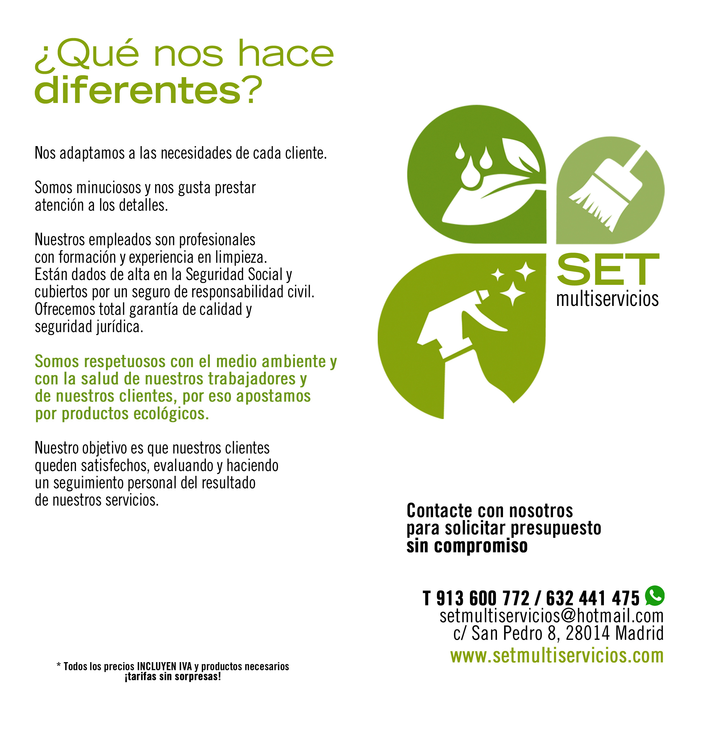 SET MULTISERVICIOS LIMPIEZA & MULTISERVICIOS T 91 36 00 772 / 632 441 475 setmultiservicios@hotmail.com C/San Pedro 8, 28014 Madrid Envíanos un mensaje